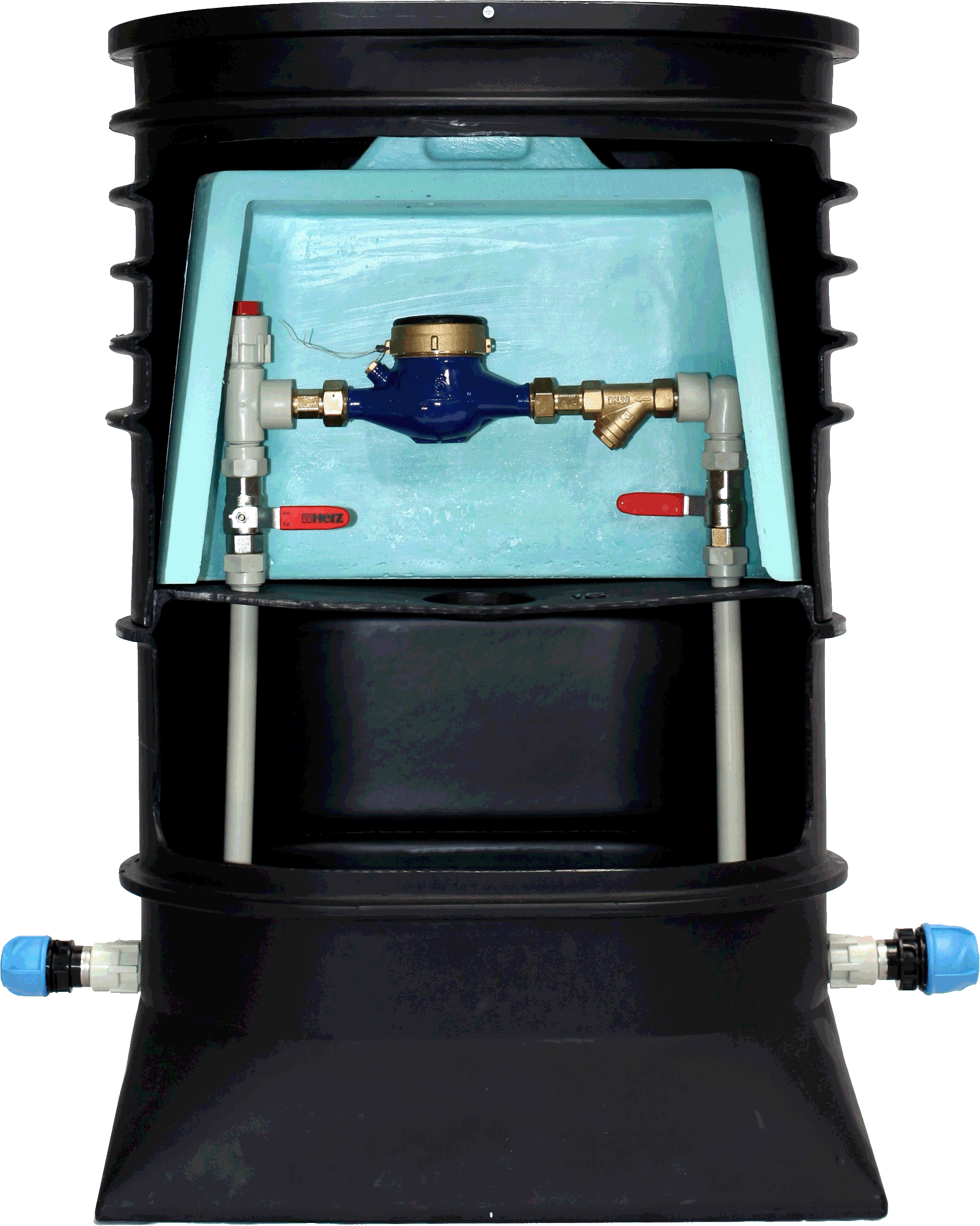 - the structure protects the water meter from freezing in winter conditions prevents freezing of the water meter and connecting installation – the chamber is bottomless, allowing heat transfer from the lower soil layer directly beneath the thermal insulation cover